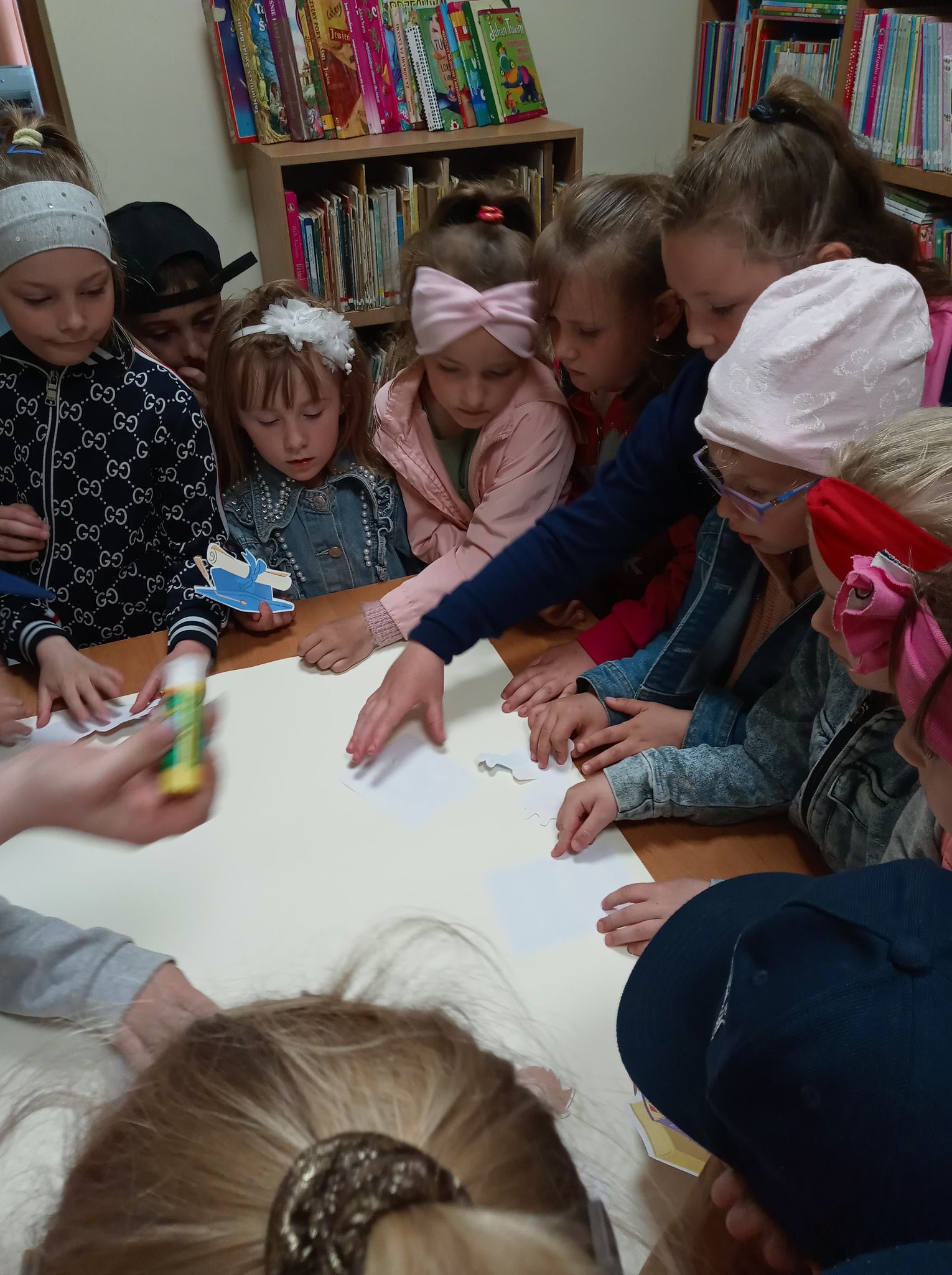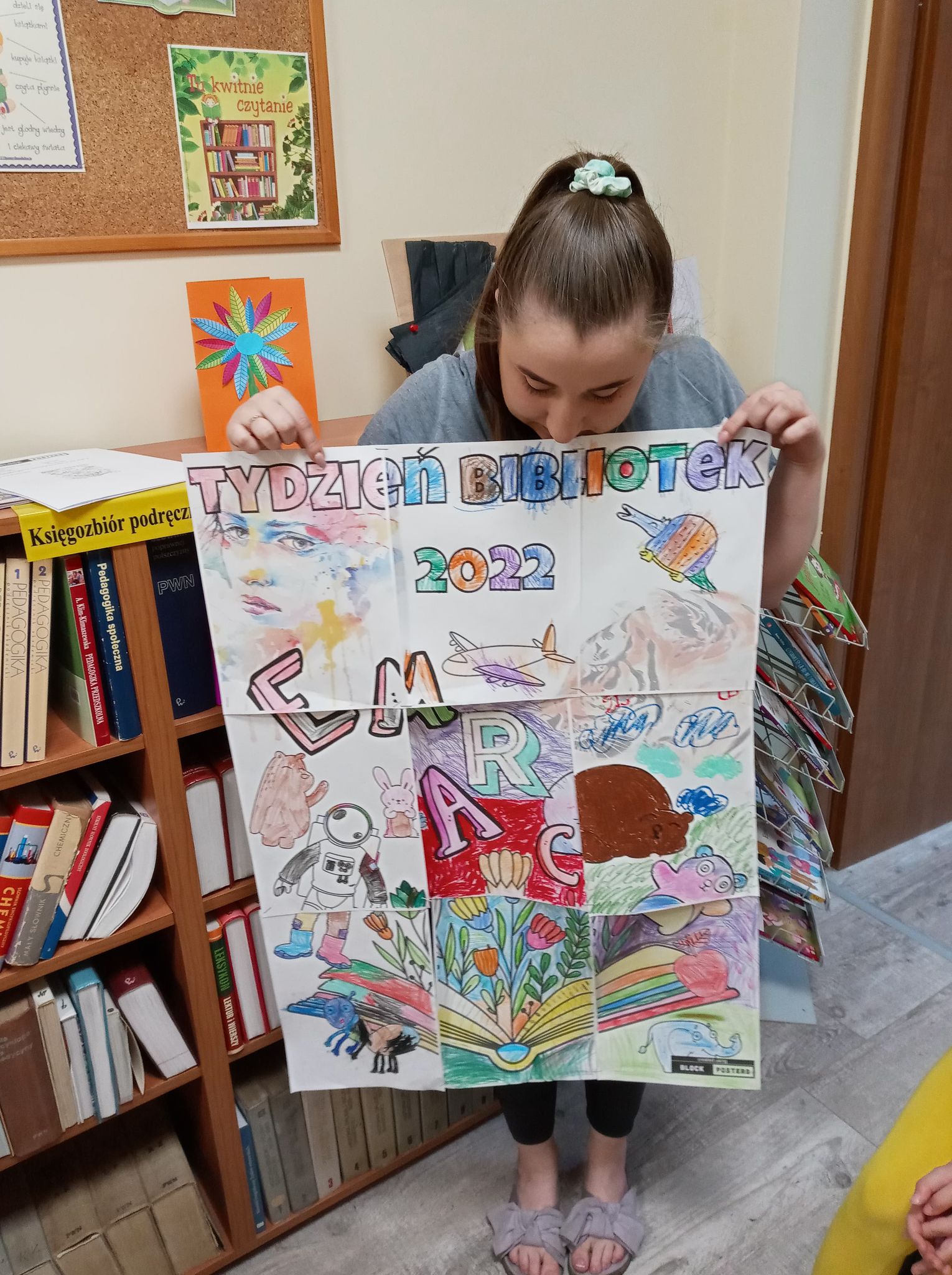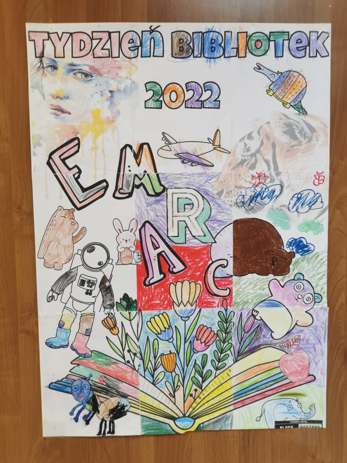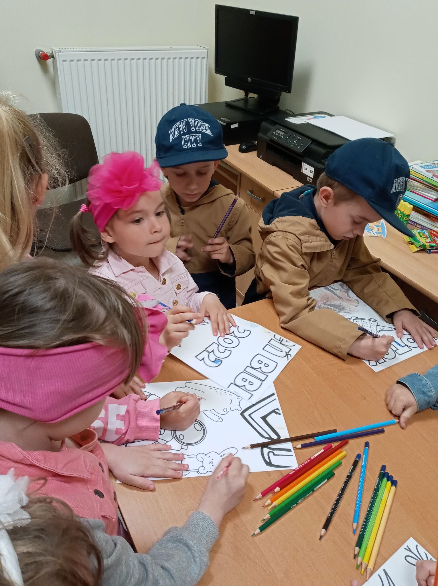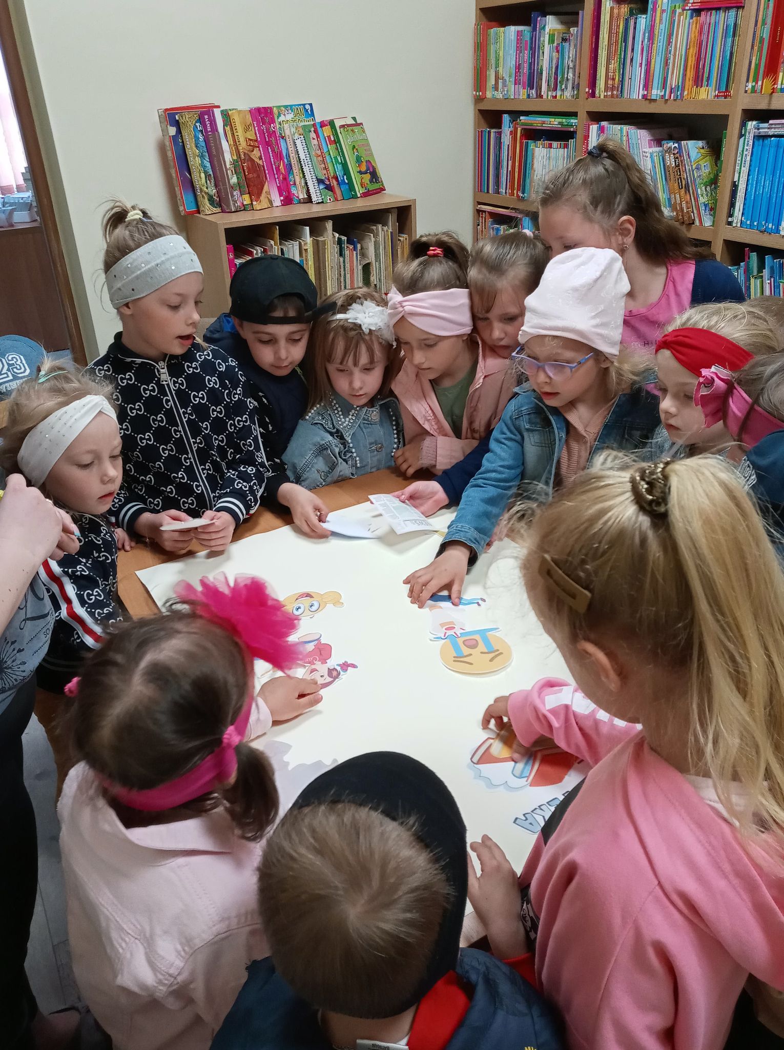 Spotkanie rozpoczęliśmy od stworzenia mapy skojarzeń z hasłem „biblioteka”, kolejno dzieci poznały drogę książki od pomysłu do czytelnika. Następnie rozwiązały zagadki i wspólnie wykonały kolorowy plakat. Na zakończenie spotkania przedszkolacy wsłuchiwali się w opowieść o pracy bibliotekarza, po czym otrzymali zagadki ze słodkim akcentem.