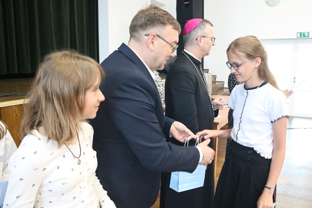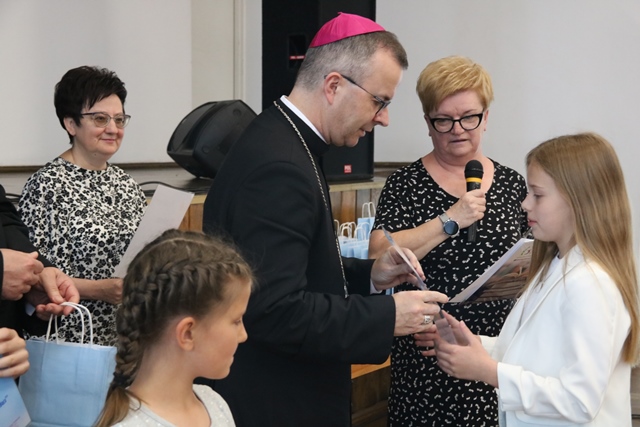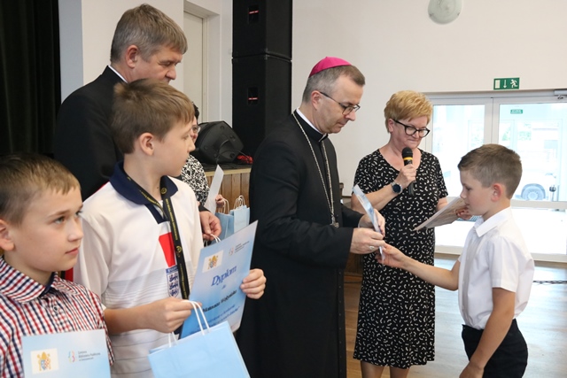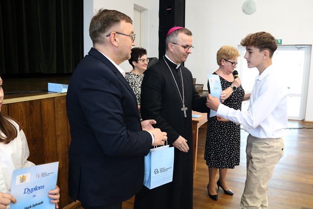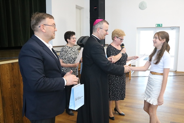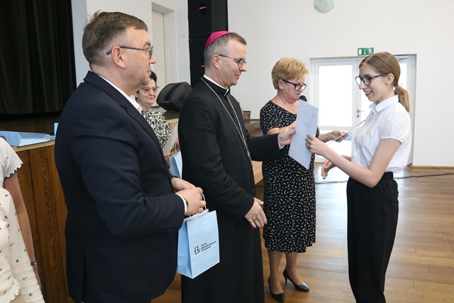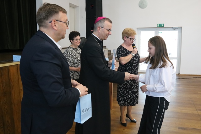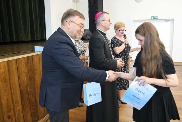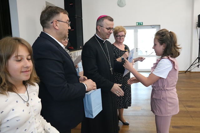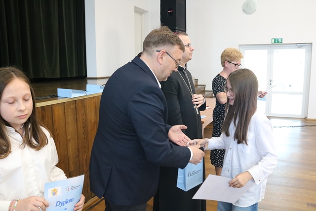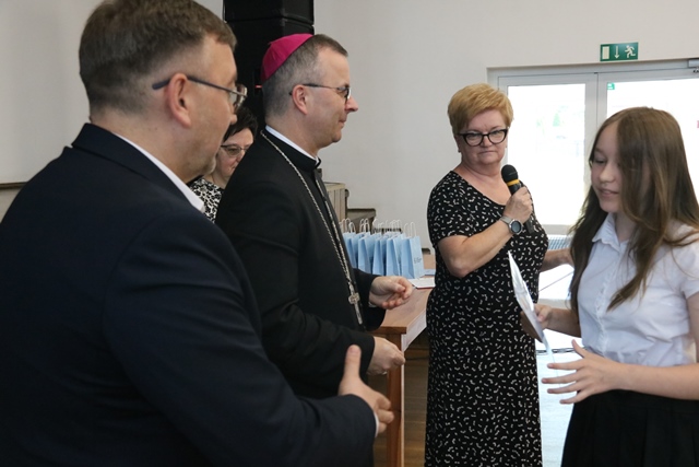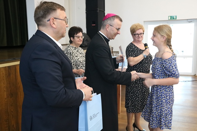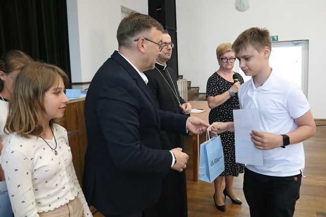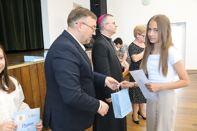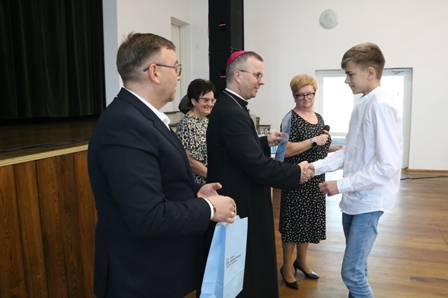 Laureatom gratulowali: ks. biskup Damian Bryl, ks. kanonik Paweł Guździoł i wójt Anatol Piaskowski.