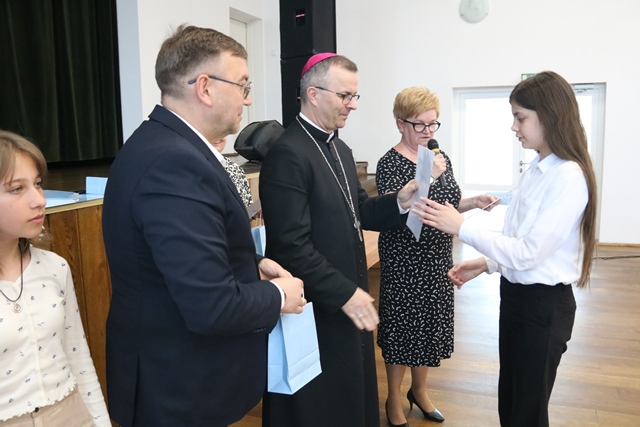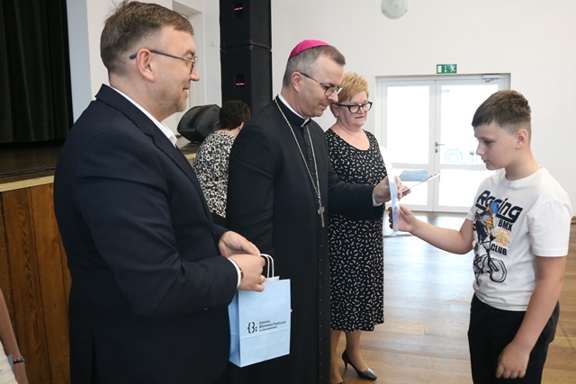 Laureatom gratulowali: ks. biskup Damian Bryl, ks. kanonik Paweł Guździoł i wójt Anatol Piaskowski.