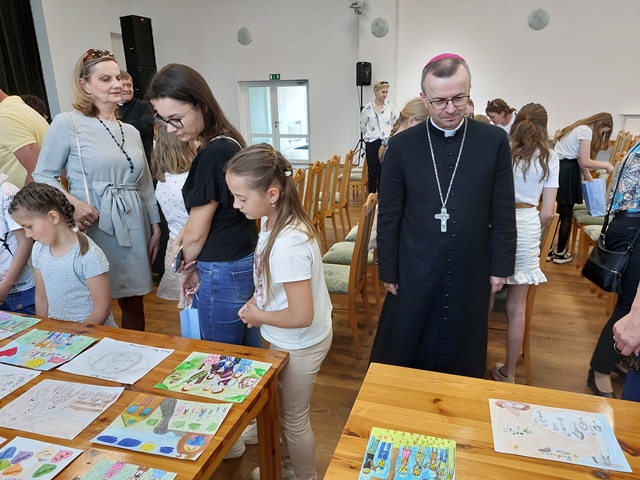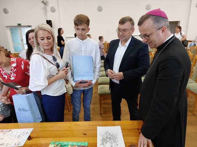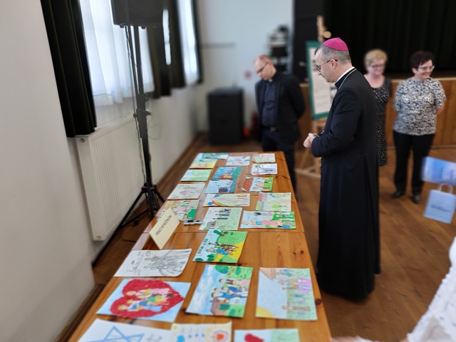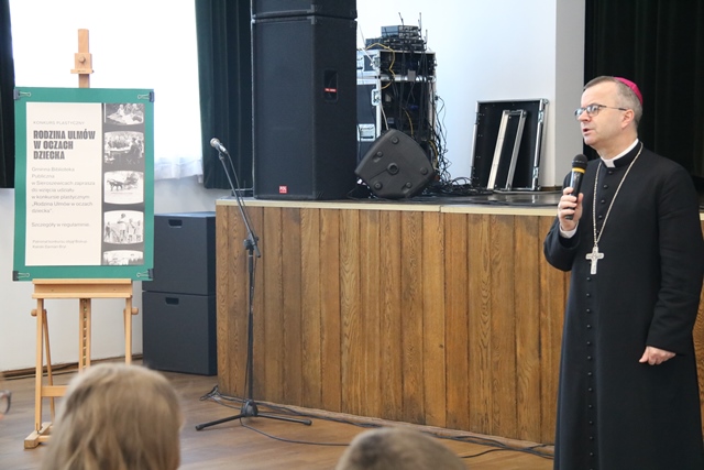 W swoim słowie Biskup kaliski podzielił się trzema myślami dotyczącymi rodziny Ulmów. Po pierwsze wskazał, że była to rodzina przeniknięta miłością. Po drugie – rodzina bardzo zaangażowana w codzienne życie, także społeczne. Trzecie słowo, które cechowało rodzinę Ulmów to odwaga. – To było niezwykłe, że oni przyjęli uciekających Żydów, bo uważali, że skoro jest potrzebujący człowiek to nie można go zostawić. Jak ważna jest odwaga, żeby nie być obojętnym wobec cierpienia. Bardzo dziękuję, że wy przez wasze prace o tym wszystkim chcieliście nam przypomnieć. Te piękne prace nas mocno poruszają i wszystkim artystom bardzo za to dziękuję – powiedział bp Damian Bryl.