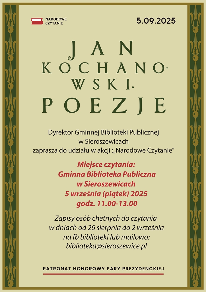 Zapraszamy na Narodowe Czytanie do biblioteki w Sieroszewicach. Tym razem sięgniemy po poezję Jana Kochanowskiego.
