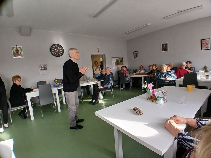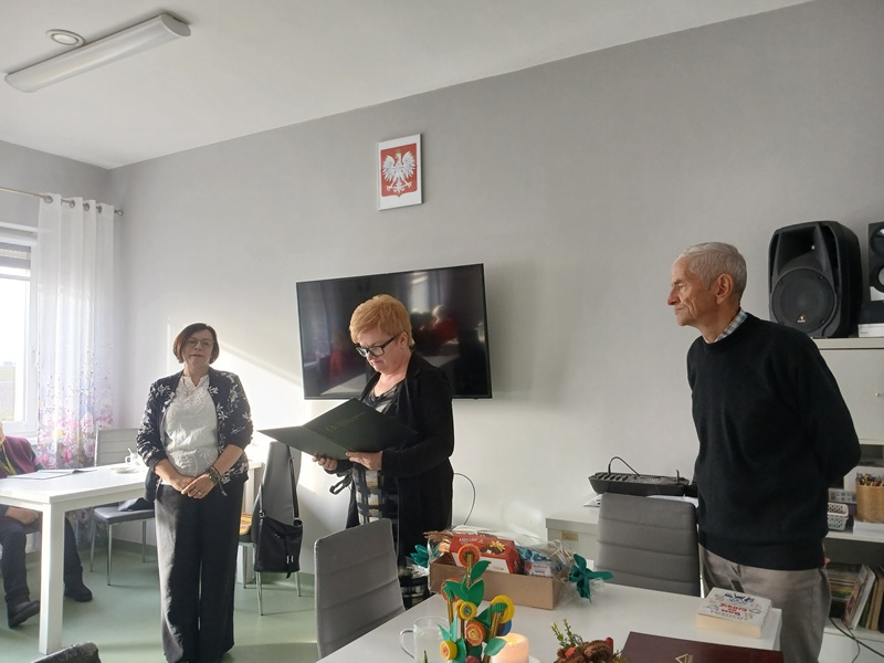 W czwartek, 13 listopada, dyrektor Gminnej Biblioteki Publicznej w Sieroszewicach Maria Marciniak oraz poeta Piotr Fałczyński gościli w Dziennym Domu Senior + w Latowicach. Okazją do złożenia wizyty jest przypadający 14 listopada Światowy Dzień Seniora. Z tej okazji dyrektor placówki złożyła seniorom najserdeczniejsze życzenia. „Z okazji Dnia Seniora wszystkim Państwu, w imieniu własnym oraz pracowników biblioteki, składam najserdeczniejsze życzenia: zdrowia, radości oraz wewnętrznego spokoju. Niech każdy dzień przynosi nowe powody do uśmiechu, a otaczający świat obfituje w życzliwość. Życzę również, aby książki towarzyszyły Państwu w odkrywaniu nowych światów, budziły wspomnienia i wnosiły do życia piękno oraz inspirację” – odczytała pani Maria, natomiast Piotr Fałczyński przeczytał seniorom wiersz napisany przez siebie na tą okoliczność. Następnie szefowa sieroszewickiej biblioteki przeczytała fragment książki Małgorzaty Kalicińskiej „Dom na głowie, czyli gang seniorów i ja”, a pan Piotr opowiedział kilka anegdotek ze swojego poetyckiego życia. W spotkaniu uczestniczyły Iwona Kryszczak, kierownik Dziennego Domu Senior+ w Latowicach, Beata Klaga i Violetta Ptaszyk, opiekunki seniorów.