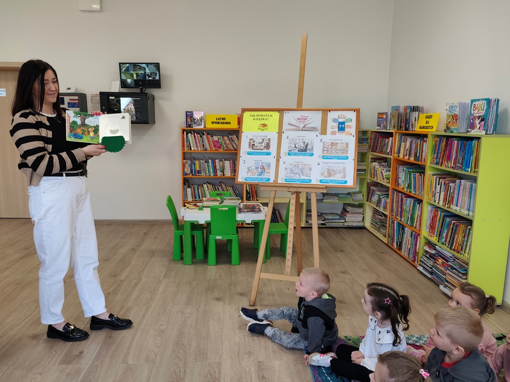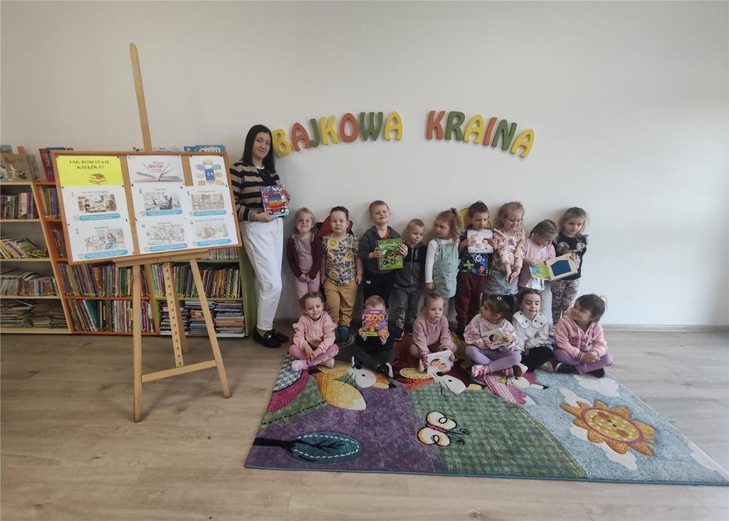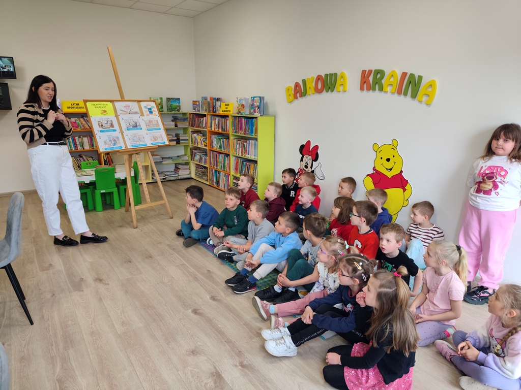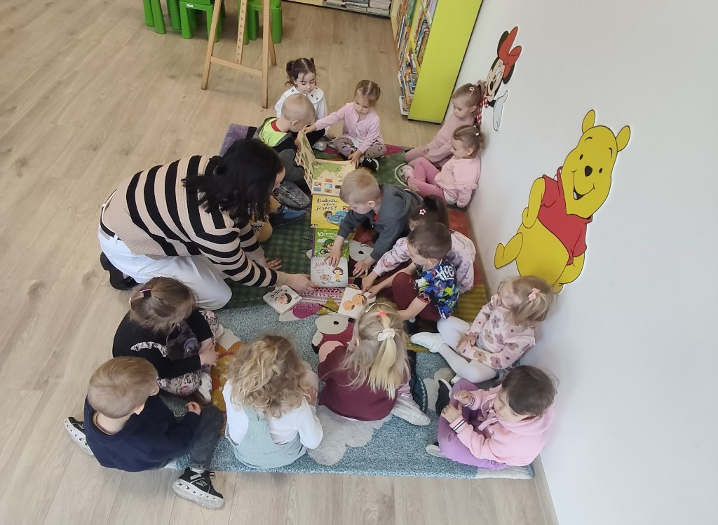 Podczas wizyty przedszkolaki dowiedziały się, jak powstaje książka i jakie etapy przechodzi, zanim trafi do rąk czytelników. Rozmawialiśmy także o tym, jak dbać o książki i dlaczego warto je szanować. Nie zabrakło również zwiedzania biblioteki, wspólnego czytania oraz prezentacji książeczek w różnych i ciekawych formach takich jak: książeczki sensoryczne, książeczki z puzzlami bądź z okienkami. Dzieci chętnie układały książki od najmniejszej do największej, a także odgadywały odgłosy zwierząt z książeczki, co sprawiło im wiele radości. Mali goście z ogromnym zainteresowaniem odkrywali świat książek i poznawali to wyjątkowe miejsce jakim jest biblioteka. Dziękujemy za odwiedziny i zapraszamy ponownie do naszej biblioteki!